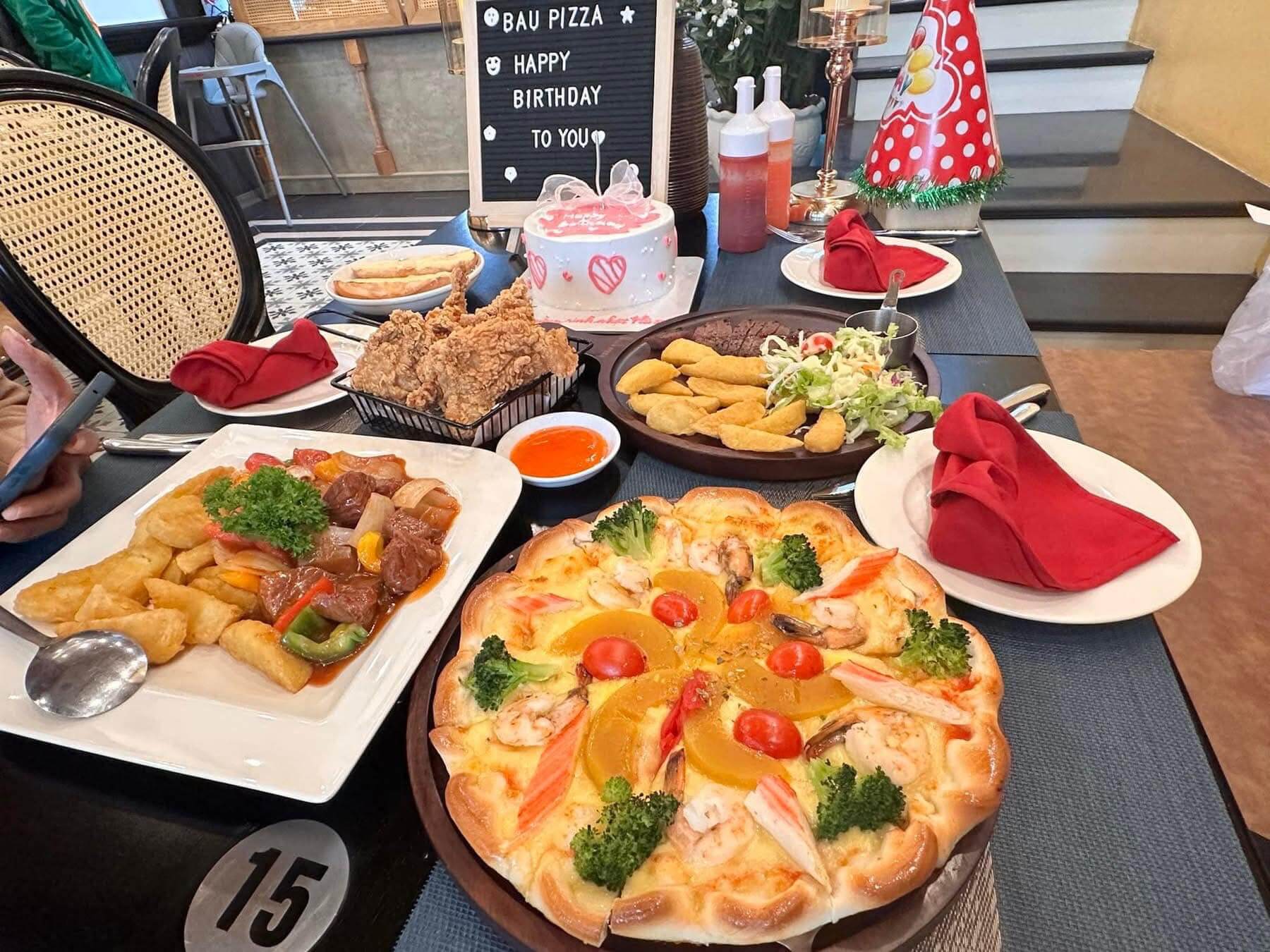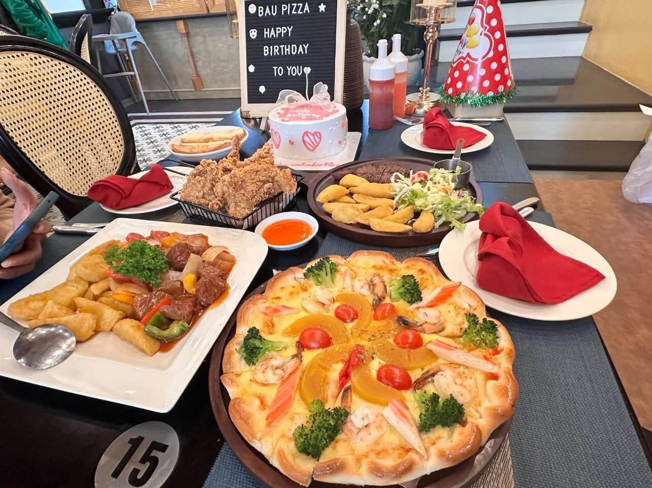 Bên cạnh thực đơn chính là pizza, Bầu Pizza còn phục vụ mỳ Ý, salad, gà rán, khoai chiên và nhiều món ăn vặt phù hợp với mọi độ tuổi. Đồ uống đa dạng, giá cả hợp lý. Phục vụ nhanh chóng là điểm cộng lớn khiến khách hàng quay lại nhiều lần.