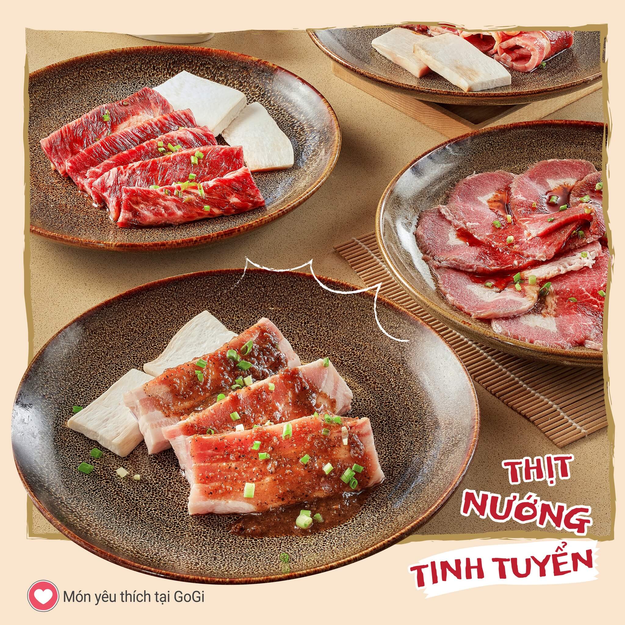 Thực đơn tại Gogi Việt Trì nổi bật với các loại thịt nướng như ba chỉ bò Mỹ, dẻ sườn, nạc vai heo và sườn non bò. Các loại thịt được tẩm ướp theo công thức riêng, nướng lên thơm ngào ngạt, mềm và đậm vị. Điểm cộng là thịt luôn tươi và được cắt lát vừa ăn, dễ nướng và không bị khô.